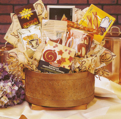 Fill a friend's home with the rich, satisfying aroma and robust flavor of the world's finest gourmet coffees. Other complimentary taste treats include German chocolate covered marble cake, cappuccino pastry puffs, espresso shortbread cookies, chocolate covered espresso beans, coffee cream filled cookies and much more. Any coffee connoisseur will love this gift of well-brewed delight. (Medium shown) |