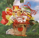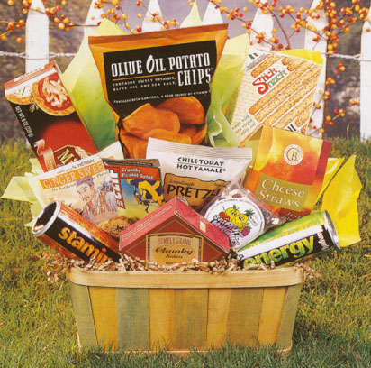 Hurray! Guilt-free snacking is here! Our two-tone country peck basket comes filled with yummy and healthy treats: potato chips made with pure olive oil and sea salt, roasted garlic & herb pretzel nuggets, sparkling guarana berry drink, sparkling citrus drink, ginger sweets, fruit munchies, an energy bar, all-natural cheese straws and more. It's a great, thoughtful gift for people who eat hearty and healthy. |
