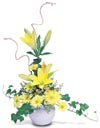 Like a ray of sunshine on a cloudy day, these yellow blossoms gleam. Lilies, Poms, Gerbera Daisies and more burst forth from a white bowl. Sunglasses, anyone? |