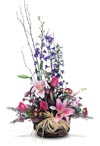 Just knowing you're thinking of them will help brighten a day. So will Dendrobium Orchids, Delphiniums, Lilies, Poms, Liatris, Eucalyptus and greenery in a natural basket. |