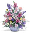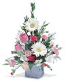 Bleary-eyed parents will brighten at the sight of Delphiniums, Snapdragons, Carnations, Alstroemeria, Poms, Caspia, Wax Flowers and more carousing in a basket. |