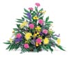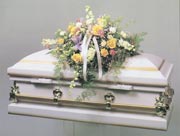 Yellow Roses, Mini-Carnations, White Larkspur, Light Purple Iris, Baby's Breath, Sprengeri, Leatherleaf and a casket saddle. |