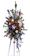 Gladiolus, Mums, Carnations, Lilies, and Greenery arranged on an easel. |