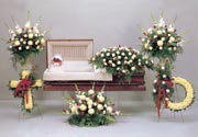 White Carnations, White Gladiolus, White Football Mums, Red Roses, Commodore, Flat Fern, Plumosa in a paper mache basket. |