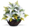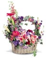 This vibrant collection of Lilies, Iris, and Garden Roses is ideal for showers, weddings or house warmings! The country style basket features a handle entwined with flowers & ivy. |